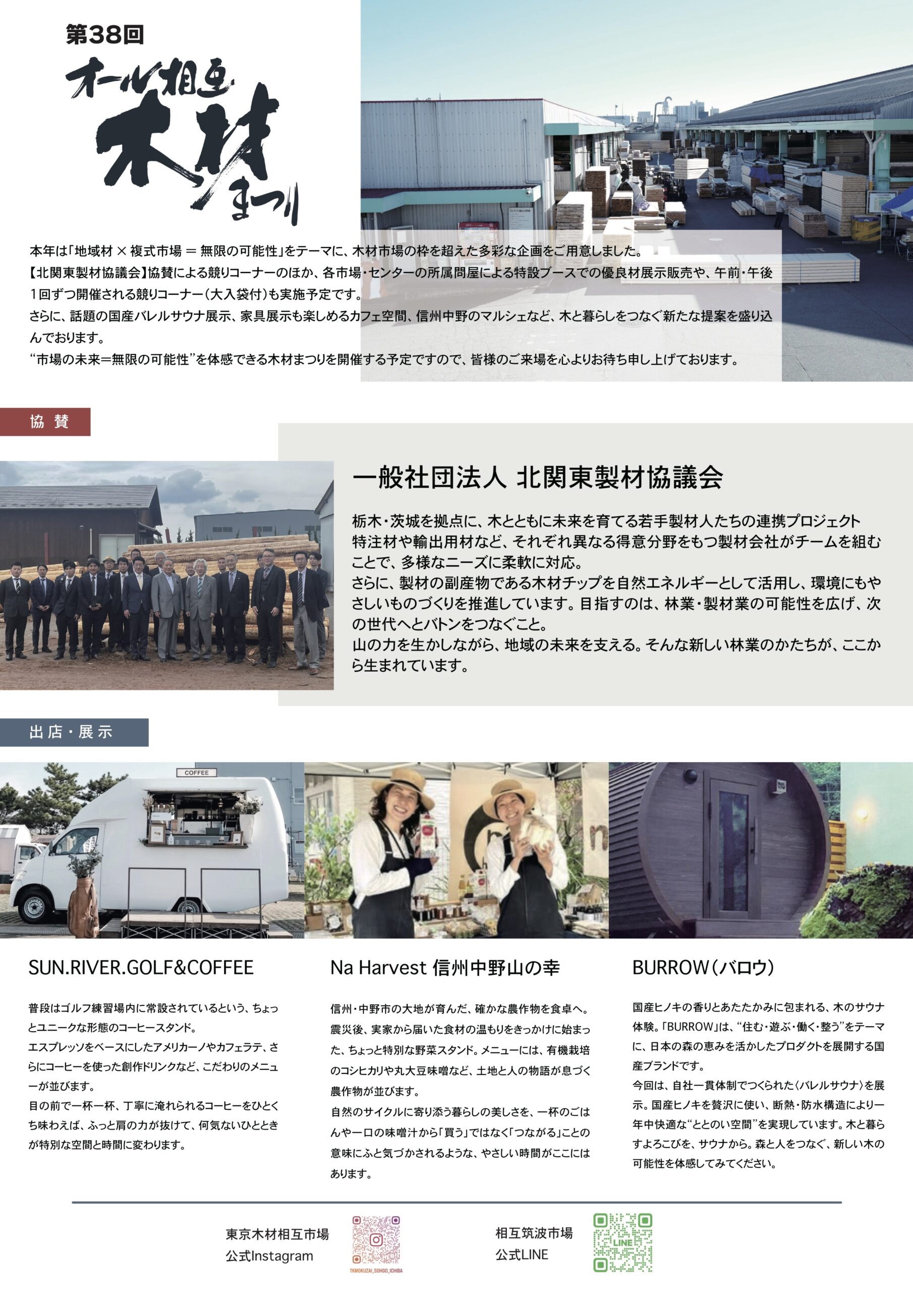 本年は「地域材 × 複式市場 = 無限の可能性」をテーマに、木材市場の枠を超えた多彩な企画をご用意しました。 【北関東製材協議会】協賛による競りコーナーのほか、各市場・センターの所属問屋による特設ブースでの優良材展示販売や、午前・午後1回ずつ開催される競りコーナー(大入袋付)も実施予定です。 さらに、話題の国産バレルサウナ展示、家具展示も楽しめるカフェ空間、信州中野のマルシェなど、木と暮らしをつなぐ新たな提案を盛り込んでおります。 “市場の未来=無限の可能性”を体感できる木材まつりを開催する予定ですので、皆様のご来場を心よりお待ち申し上げております。