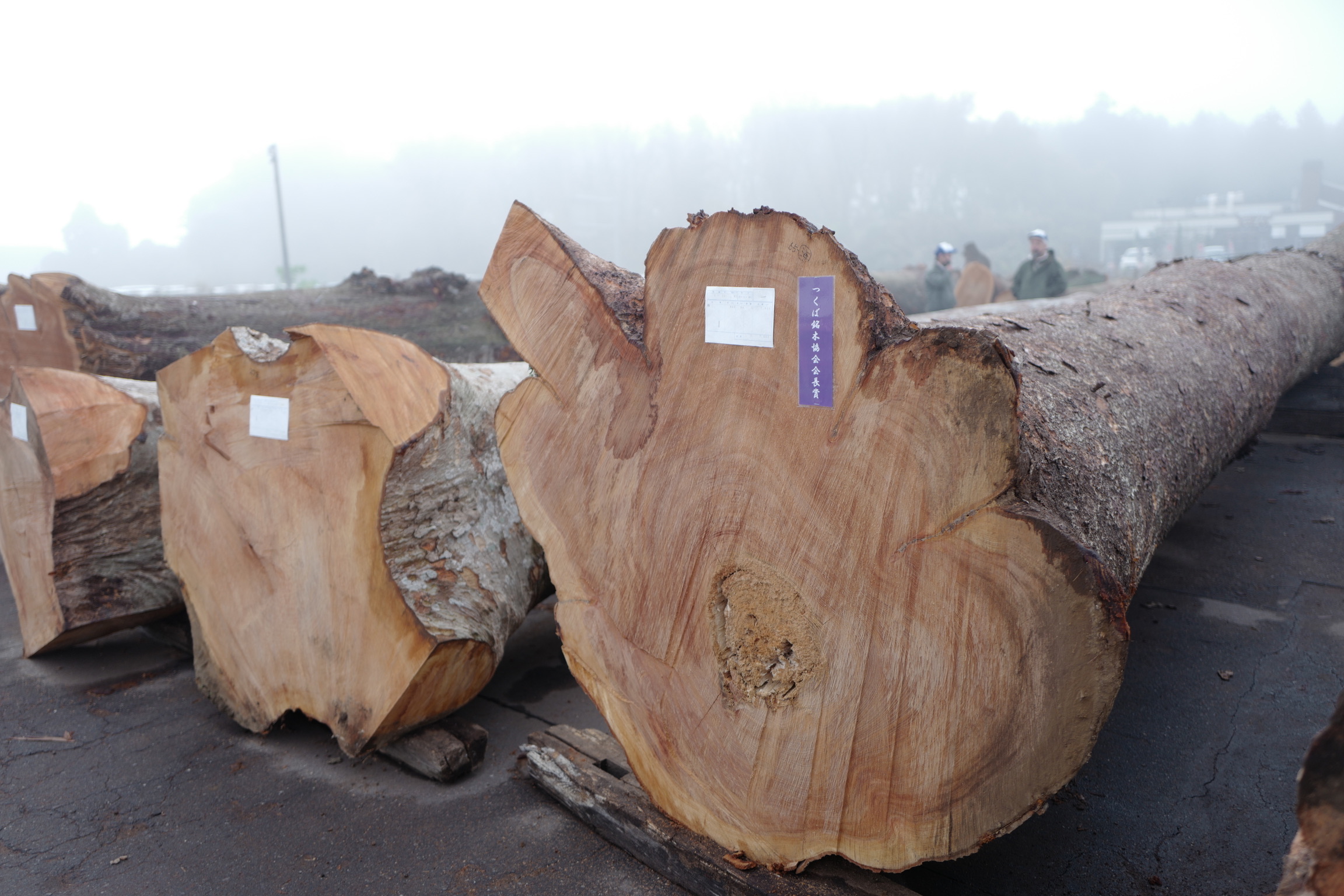 栃木県産の250年生(6.6m×110cm、8㎥)で、樹齢や目揃いなどが評価され林野庁長官賞を受賞した山長銘木のケヤキ丸太をはじめ、つくば市長賞には山岸木材工業のクス丸太(5m×100cm、5㎥)が選ばれました。クス丸太については「人の目の高さあたりの部分が太く、5m近くもある丸太は滅多に出ない」という声が多く聞かれました。