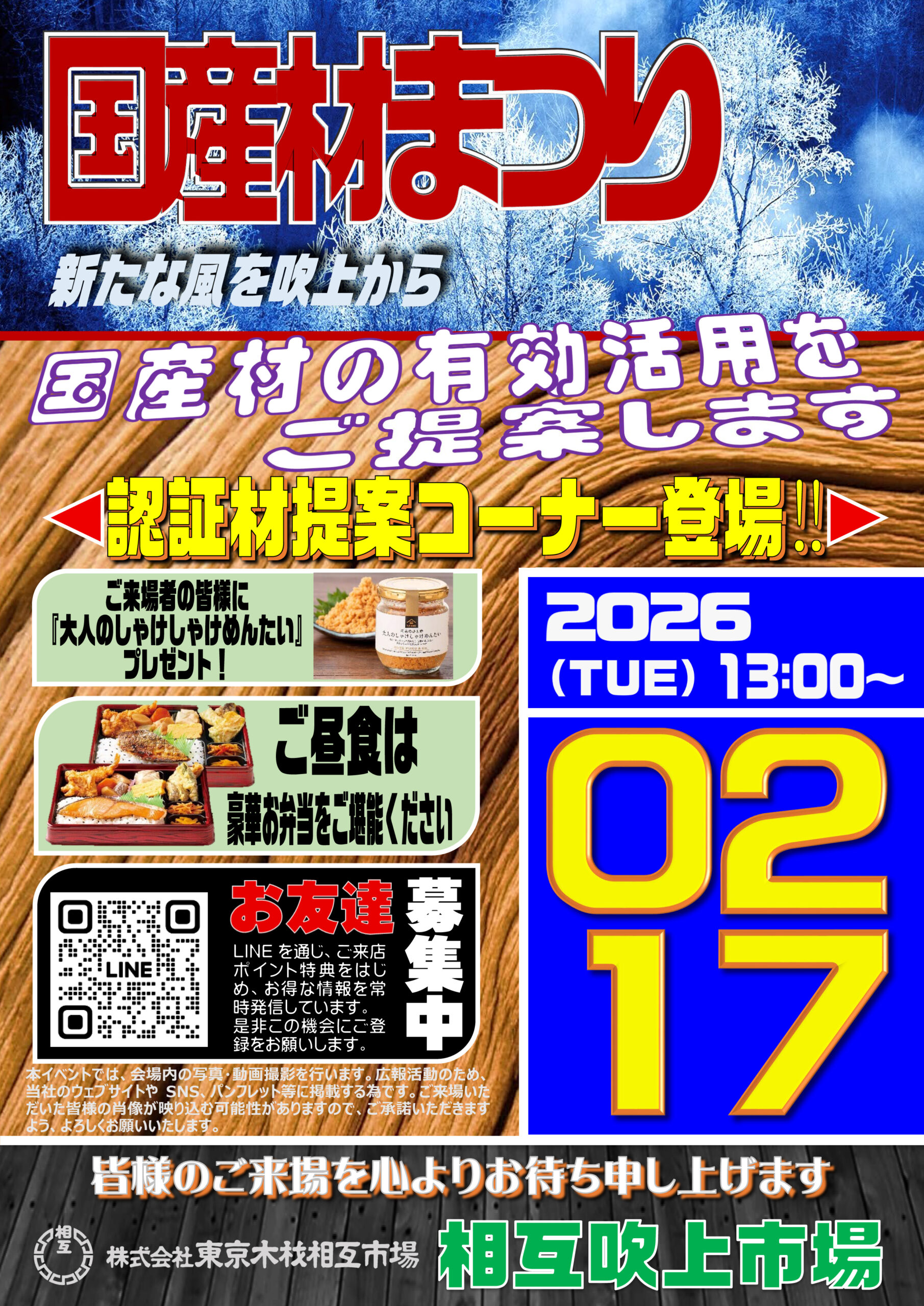 「今年は年初から、ベネズエラ情勢やイランのデモ、中国の日本への圧力強化や円安、衆議院の解散総選挙と、不穏な、不安定な激動の時代の幕開けとなった訳ではございますが、私どもとしましては、人や社会が進化する、アップデートするチャンスと捉えて、ポジティブに明るい未来目指して、今年も本気で木材や建材、プレカット等の住宅資材やサービスをご提供する所存でございます。