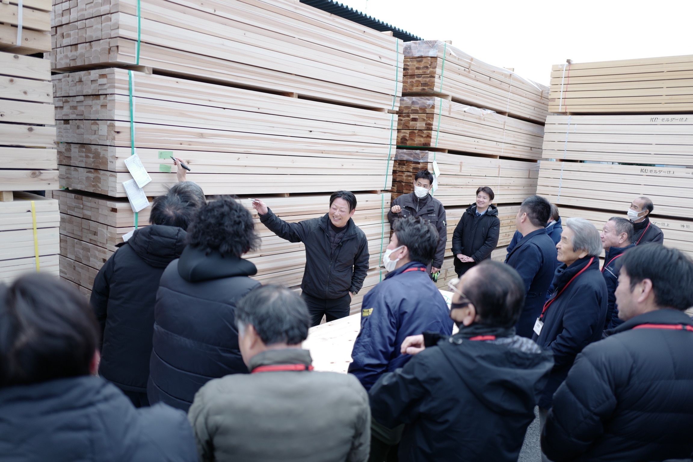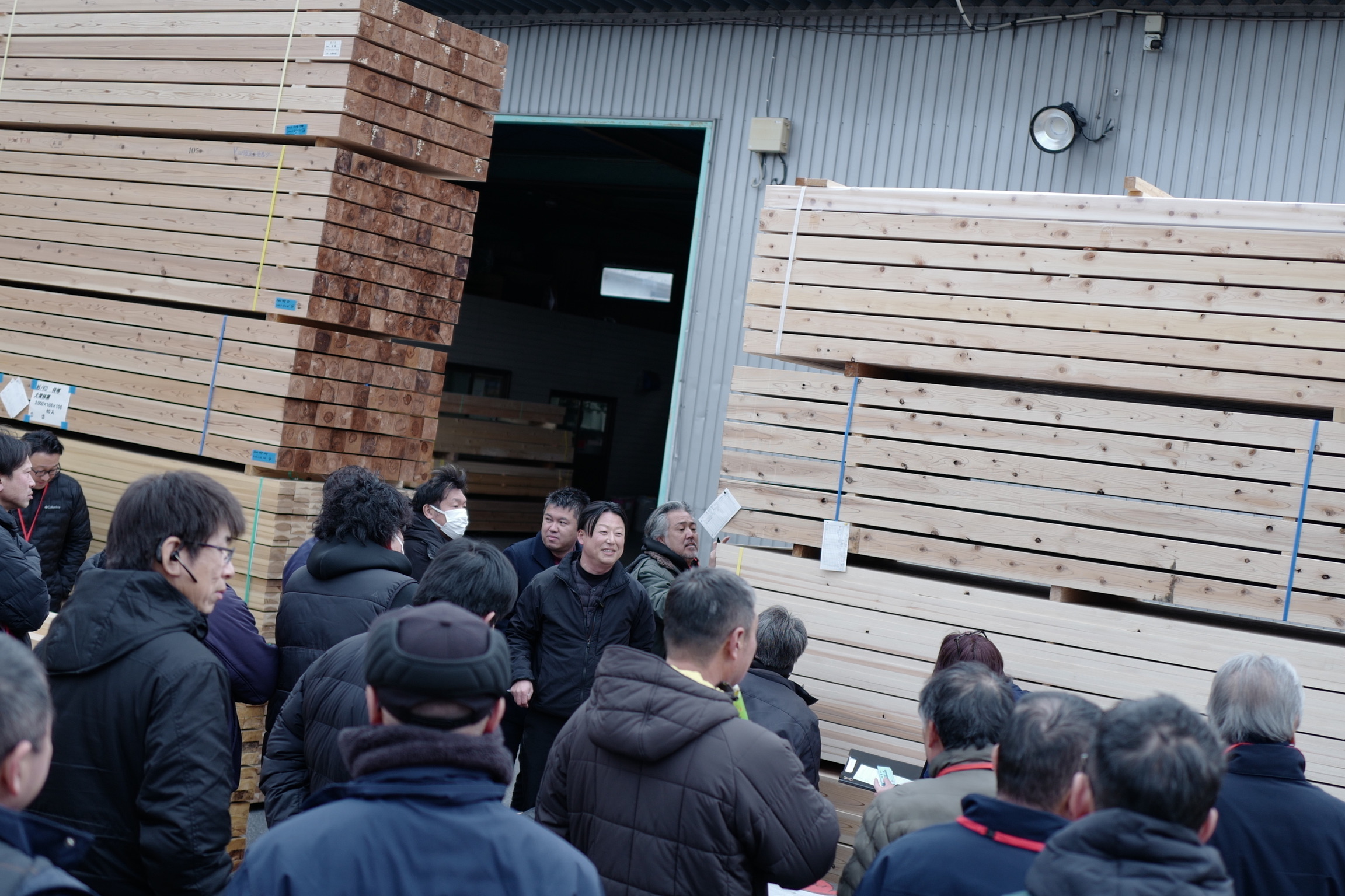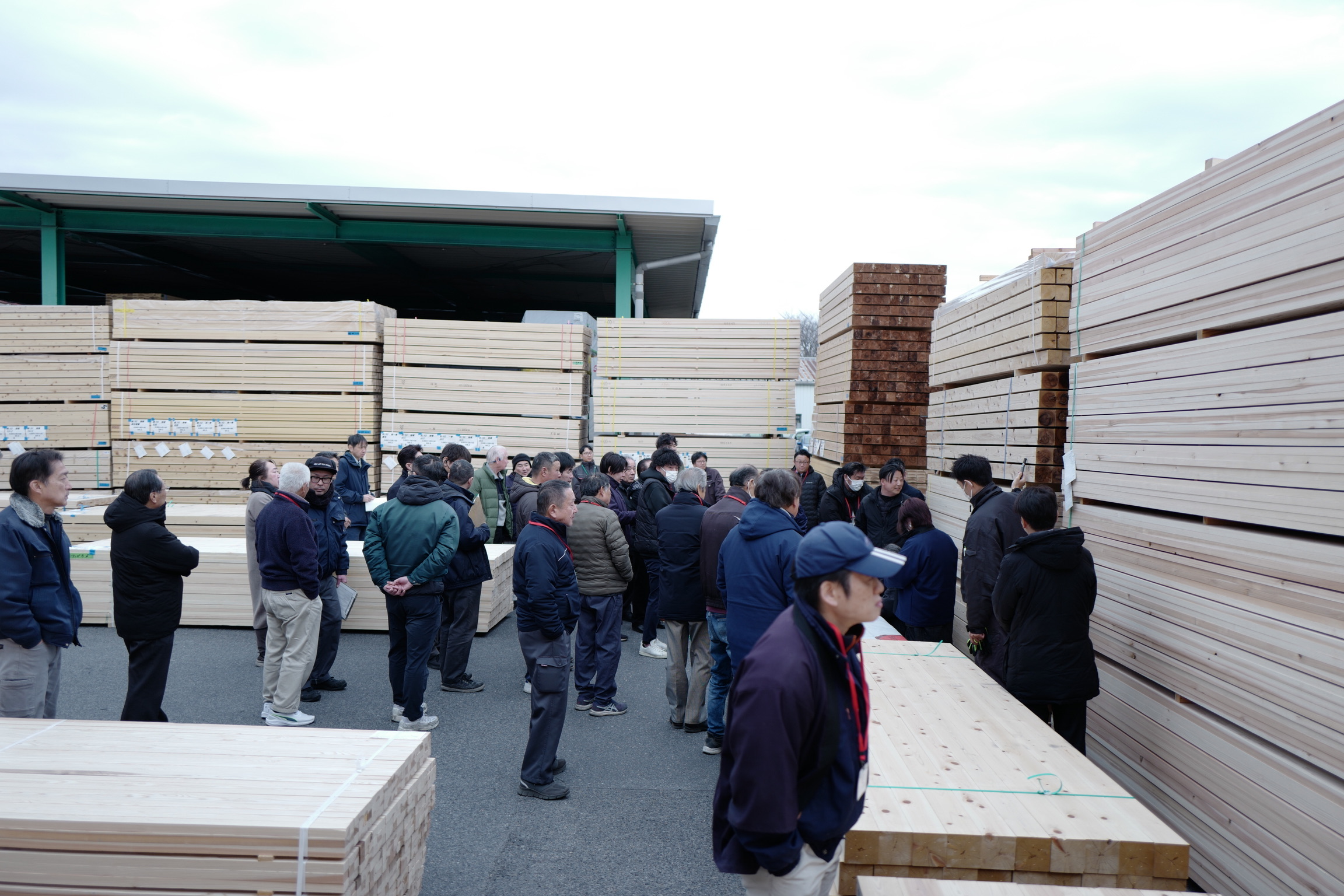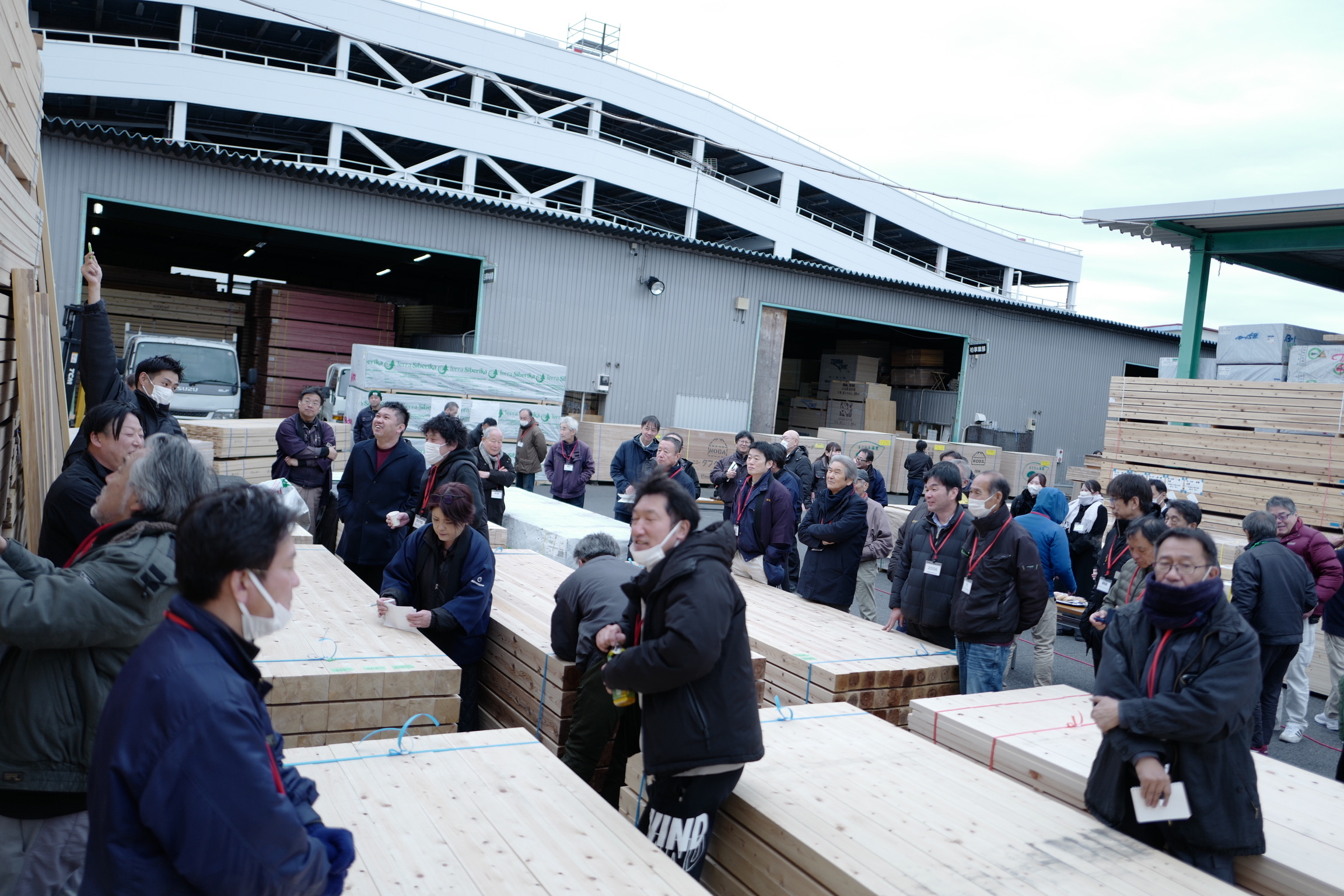 柏木材部、森林商事がこれまで以上に内外産の製材品を揃え、今回も前回よりさらに売上高が伸びる盛り上がった市となりました。現場では荷姿や素性を確かめながら、短いやり取りの中で判断が進んでいく、初荷らしいテンポ感が随所に見られました。