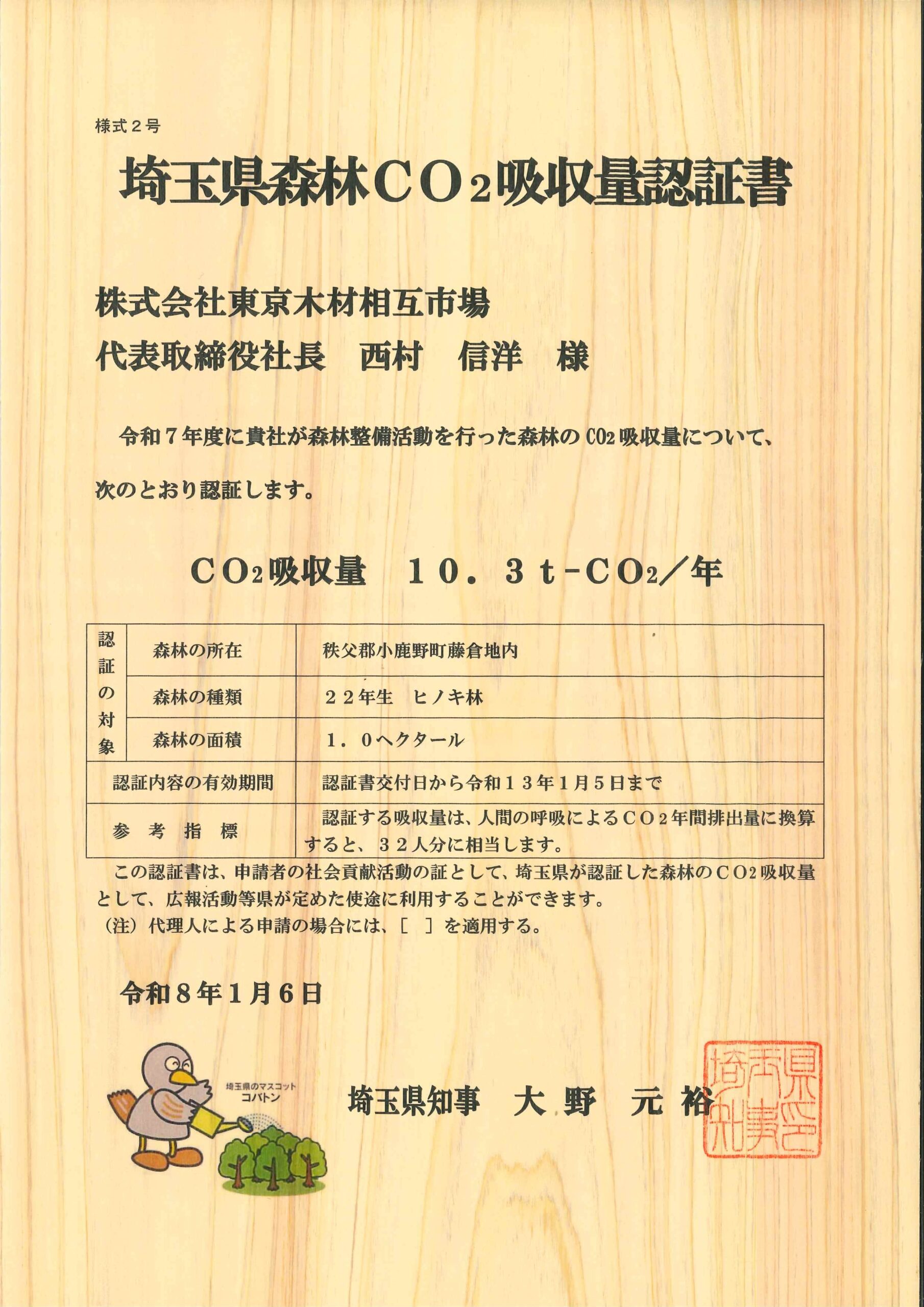 このたび当社は、埼玉県が発行する【埼玉県森林CO₂吸収量確認書】を取得いたしました。